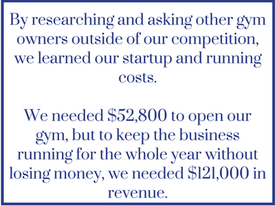 We had learned in our research that one of the biggest mistakes new businesses make is running out of capital to keep the gym going. So, we buffered ours with a 20% margin of error for hidden or unexpected costs, which came out to be $8,800. Altogether, we needed $52,800 to open. This was the minimum amount we needed (with a little extra safety net).