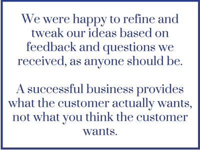 Our main purpose here was to see what our customers wanted and what would work before investing $50,000 dollars on a business people may not have wanted.