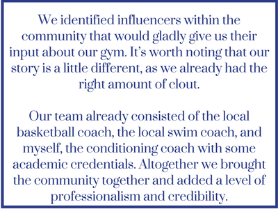 Now that we had our idea and knew how much we needed to keep the business running, the next step was finding well-known people within the community to support our yet-to-be gym business. We needed key influencers in the community.